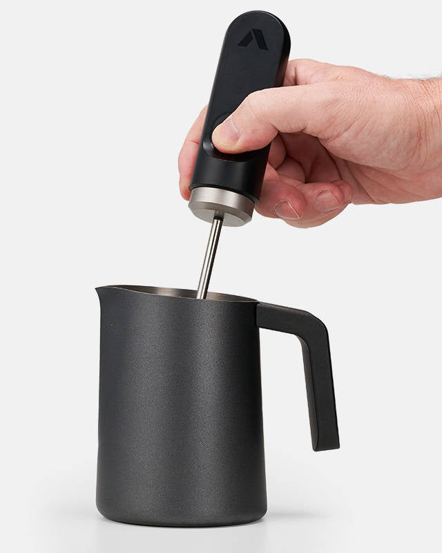 จุ่มหัวฟองนม ให้ต่ำว่าผิวนมเล็กน้อยปั่นนมให้วน และใส่อากาศเข้าไป